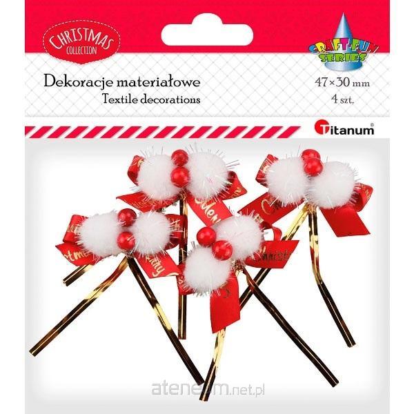 Kokarda 47x30mm czerwona z napisem Merry Christmas z białymi pomponami i owocami ostrokrzewu z mocowaniem twist 4szt.