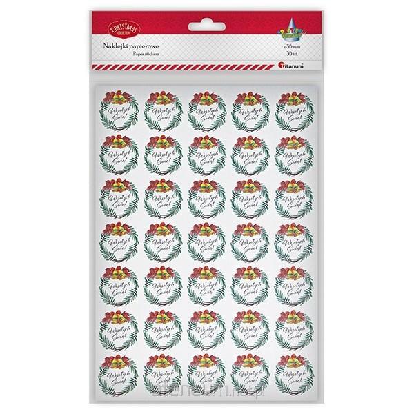 Naklejki papierowe wianek z dzwonkami i napisem Wesołych Świąt O35mm 35szt.