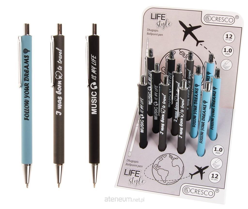 Ciekawa propozycja długopisu LIFE STYLE. Grubość linii pisania 1 mm. Mechanizm włączania pstrykany. Wykończenia srebrne. Korpus: powierzchnia softowa. W opakowaniu mix 12szt w trzech kolorach oraz z trzema tematycznymi nadrukami.
