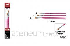 Profesjonalny pędzel z korpusem z naturalnego lakierowanegodrewna i czarną końcówką. Metalowa skuwkai białe syntetyczne włosie. Długość: 20 cm.Można je stosować z farbami akwarelowymi, akrylowymii temperowymi. Blister po 3 sztuki: 2 pędzlez skuwką i pędzel płaski o numerach 6 i 3/8idealny do wypełniania, wykonywania krawędzi ipociągnięć pędzlem; i okrągły pędzel nr 0 do wypełnianiamałych obszarów i mieszania farby z wodąw celu uzyskania technik na mokro, pociągnięćlub drobnych detali dzięki cienkiej końcówce.