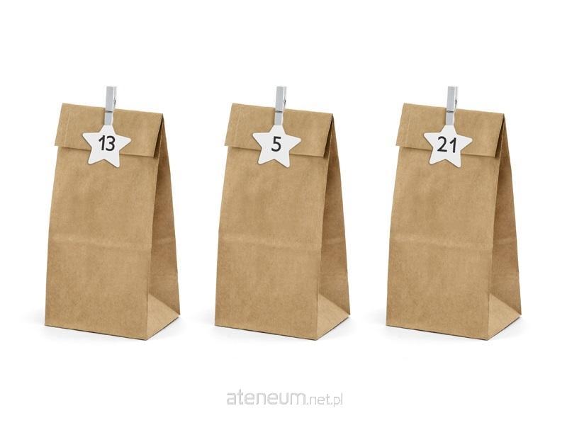 Kalendarz adwentowy Torebki, zestaw zawiera: 24 torebki w kolorze kraftowym, 24 gwiazdki z numerami oraz 24 drewniane klamerki w kolorze białym. Wymiary torebek ok. 8 x 6,5 x 21 cm. Produkt do samodzielnego złożenia.(1 op. / 24 szt.)
