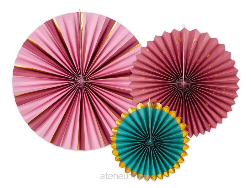 Rozety dekoracyjne wykonane z papieru w kolorze burgundowym oraz zielonym, średnice po złożeniu ok. 26 cm, 35 cm, 43 cm.(1 op. / 3 szt.)