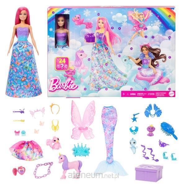 Z Kalendarzem adwentowym Kraina Fantazji Barbie® Dreamtopia przedświąteczny czas będzie miał prawdziwie magiczny klimat. Znajdziesz tu mnóstwo baśniowych niespodzianek! Możesz otwierać po jednej niespodziance dziennie przez 24 dni lub odpakować je wszystkie jednocześnie dla jeszcze większej zabawy. Pierwszego dnia odkryj lalkę Barbie® o różowych włosach, a potem odpakowuj ubranka i akcesoria, dzięki którym możesz przekształcić ją w syrenkę, księżniczkę lub wróżkę. Wśród niespodzianek są ogon syrenki, skrzydełka wróżki, mały jednorożec i inne magiczne zwierzątka, baśniowe opaski do włosów i niesamowite akcesoria. Dzięki tak wielu niespodziankom Kalendarz adwentowy Barbie® Kraina Fantazji to doskonały prezent dla dzieci od 3 roku życia. Lalka nie stoi samodzielnie. Kolory i elementy dekoracyjne mogą się różnić.
