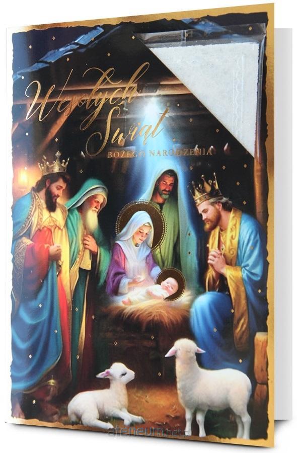Świąteczna kartka z opłatkiem w zestawie.Kartka jest zdobiona złotą folią.