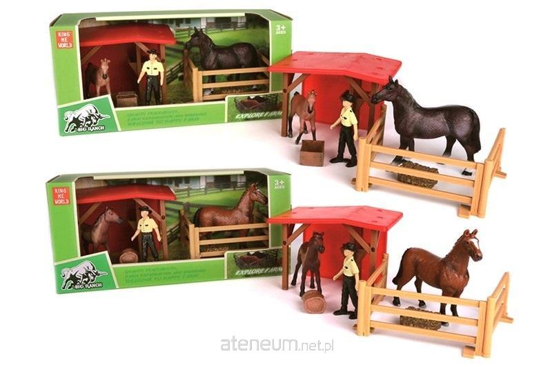 W zestawie: figurka rolnika, 2 figurki koni, siano, koryto, zagroda z 2 płotkami, wys. figurki 9 cm, wym. opak. 34 x 14 x 15 cm, 3+