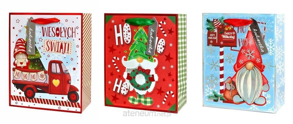 Cechy szczególne: typ produktu: torba na prezent, zdobienie: metalizowana, kolorowa folia, wielkość: 17,7 x 22,8 x 9,8 cm okazja: Boże NarodzenieMix wzorów - wysyłka losowo, cena za 1 szt