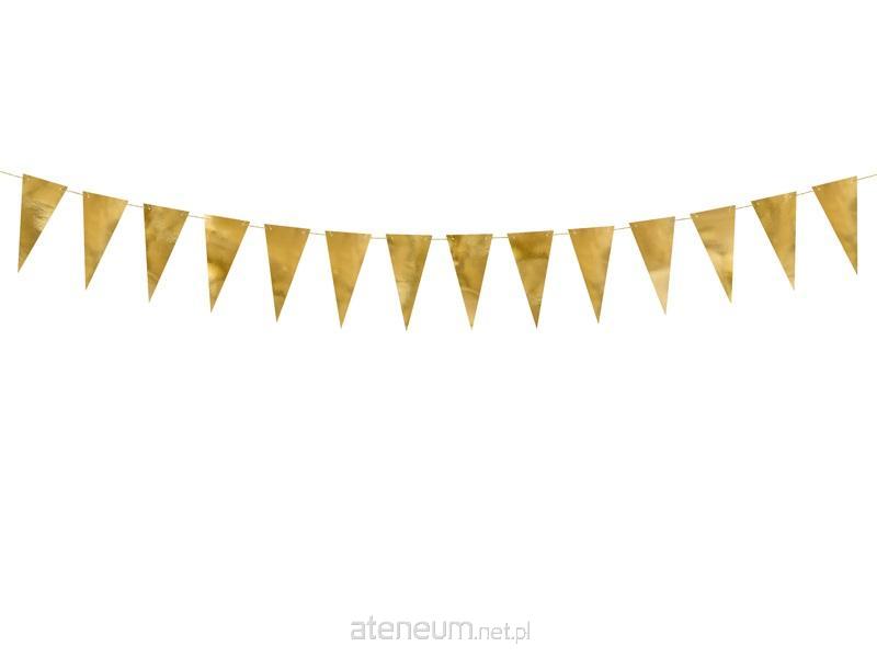 Girlanda flagietki w kolorze złotym lustrzanym, do samodzielnego złożenia, zestaw zawiera 14 flagietek i ok. 3 m złotego sznurka, wymiary po złożeniu: wysokość ok. 13 cm, długość ok. 2,15 m.