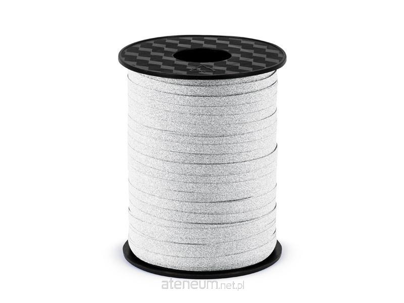 Wstążka plastikowa brokatowa w kolorze srebrnym, szerokość ok. 5 mm, długość ok. 225 m.