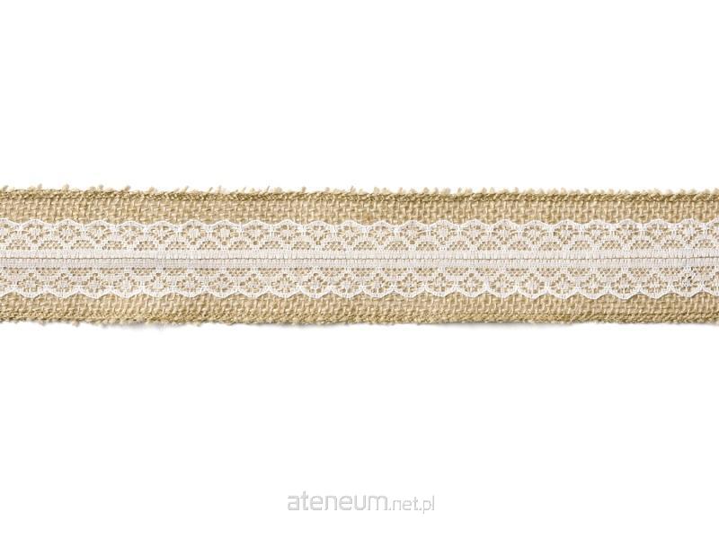 Taśma jutowa z białą koronką, szerokość ok. 5 cm, długość ok. 5 m.