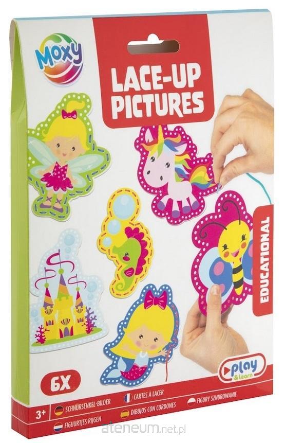 Znajduje się 6 sznurków w różnych kolorach, 6 koronkowych ilustracji (zależy od wariantu). Produkt uczy dzieci wiązania.