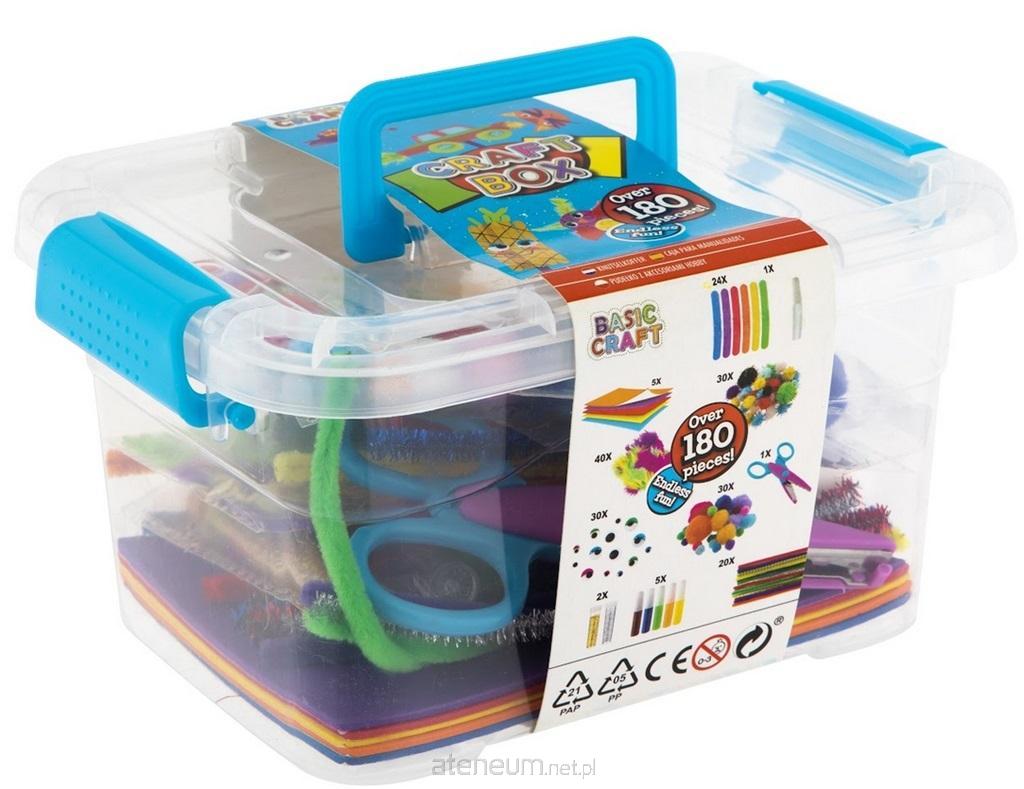 Pudełko na rękodzieło 20x15x12 cm. Ponad 180 różnych elementów, Brokat, nożyczki, kolorowe druciki i pomponiki..