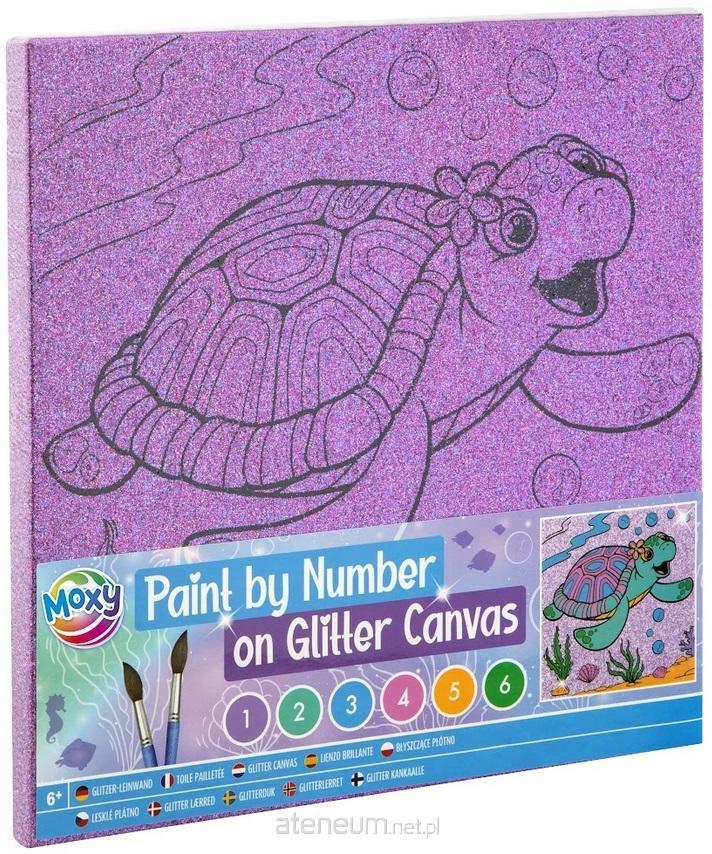 Malowanie po numerach, na płótnie brokatowym, o wymiarach 25x25 cm. Dostępne 3 rodzaje: Zółw, Jednorożec, Mandala kwiatowa