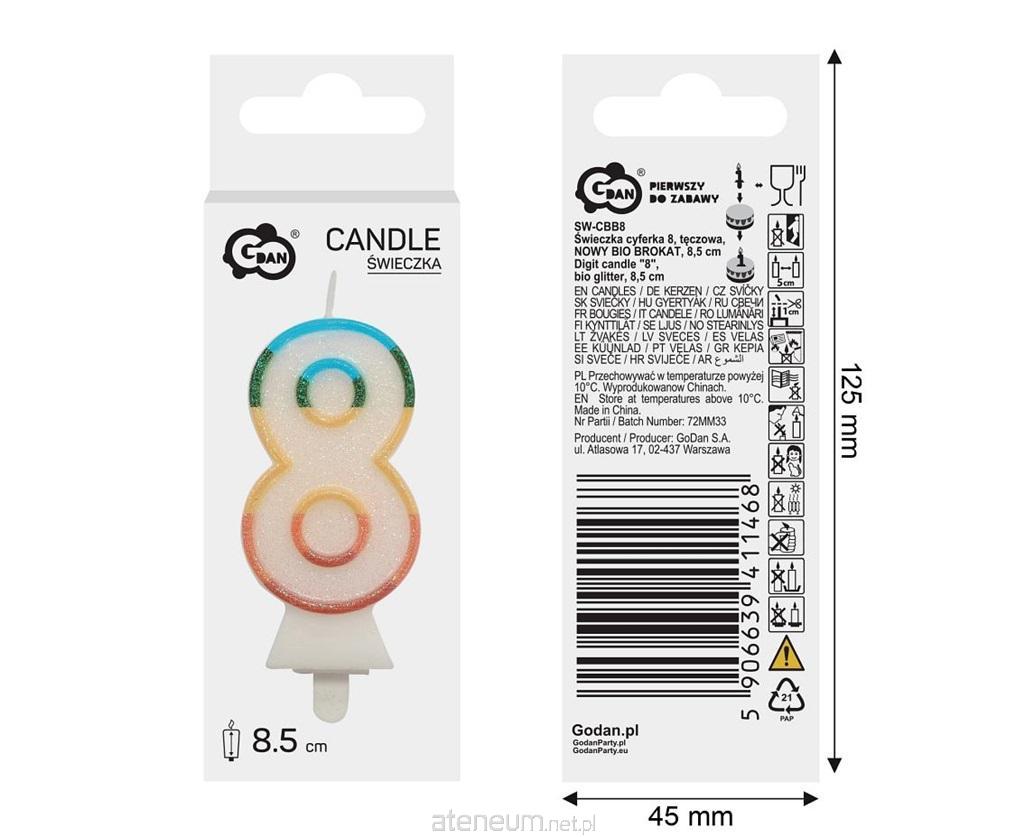 ŚWIECZKA CYFRA 8, TĘCZOWA, BIO BROKAT