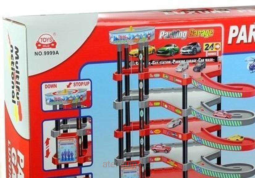 Pięciopiętrowy garaż z windą Kolorowy parking z windą to zestaw, który z pewnością sprawi ogrom radości każdemu chłopcu, który uwielbia bawić się resorakami. Pięciopiętrowy garaż połączony z windą jest dopasowany do dołączonych do zestawu autek i helikoptera, a przede wszystkim do małych rączek kilkulatka. Rozmiar zabawek sprawia, że chłopiec z łatwością może zaparkować autka na każdym, wybranym przez siebie poziomie. Konstrukcja zabawki wykonana jest z plastiku, dzięki czemu jest bardzo stabilna, co gwarantuje zarówno bezpieczną, jak i przyjemną zabawę. W zestawie znajdują się: - elementy konstrukcyjne do złożenia parkingu, - winda, - helikopter, - 6 autek, - znaki drogowe, - barierki i elementy infrastruktury, - ozdobne naklejki. Dziecięcy zestaw motoryzacyjny składa się z wysokiej konstrukcji parkingu, a także wielu dodatkowych elementów - autek, helikoptera, naklejek służących do ozdobienia toru, znaków drogowych i pozostałych elementów infrastruktury. Pięciopiętrowy parking zbudowany jest z dużej podstawy oraz zjeżdżalni, z której mogą zjeżdżać autka, oraz manualnie obsługiwanej windy. Po umieszczeniu wybranego samochodu w windzie należy kręcić pokrętłem znajdującym się w pokrywie windy, by wprawić ją w ruch. Po dotarciu do wybranego piętra można zaparkować auto na wolnym miejscu, a do windy wjechać innym pojazdem. Zarówno małe samochodziki typu resorak i helikopter, jak i garaż, odznaczają się nie tylko innowacyjnym wzornictwem, ale i pierwszorzędnym wykonaniem. Wnętrza zabawkowych samochodzików skrywają pełne wyposażenie - fotele dla kierowcy i pasażera, co podnosi poziom realności zabawy. Jesteśmy przekonani, że każdy chłopiec odnajdzie w tym zestawie coś, co zaangażuje go w zabawę na długie godziny. Elementy wchodzące w skład zestawu wykonane są z atestowanego, bezpiecznego dla maluchów tworzywa. Garaż posiada certyfikat CE, ponadto jego produkcja jest zgodna z normą EN 71, co stanowi o bezpiecznej i komfortowej zabawie. Konstrukcja parkingu pozbawiona jest ostrych elementów, dzięki czemu mogą bawić się nią chłopcy powyżej 3. roku życia. Wielopoziomowy garaż wraz z akcesoriami zapakowany jest w czerwone, kartonowe pudełko, na którego górze umieszczona jest rączka. Wymiary wybranych elementów: - autka: 7,5 cm x 3,5 cm x 3,5 cm, - helikopter: 11 cm x 4 cm x 3 cm. Wymiary opakowania zabawki: - 70 cm x 42,5 cm x 12,5 cm.