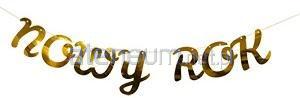 Girlanda z napisem "NOWY ROK" o długości 105 cm i szerokości 14 cm, idealna do dekoracji sylwestrowych i noworocznych. Ta elegancka girlanda, wykonana z błyszczącego złotego papieru doskonale nada się do dekoracji ścianki do zdjęć, sali, czy imprezy w domu. Klasyczna złota girlanda jest prosta do zawieszenia. Jej złota powierzchnia idealnie pasuje do różnych ozdób, co pozwala na tworzenie unikalnych kompozycji z balonami, fotościanką, serpentynami. Wszechstronne zastosowanie - idealna jako dekoracja na drzwi, ścianę oraz inne miejsca.