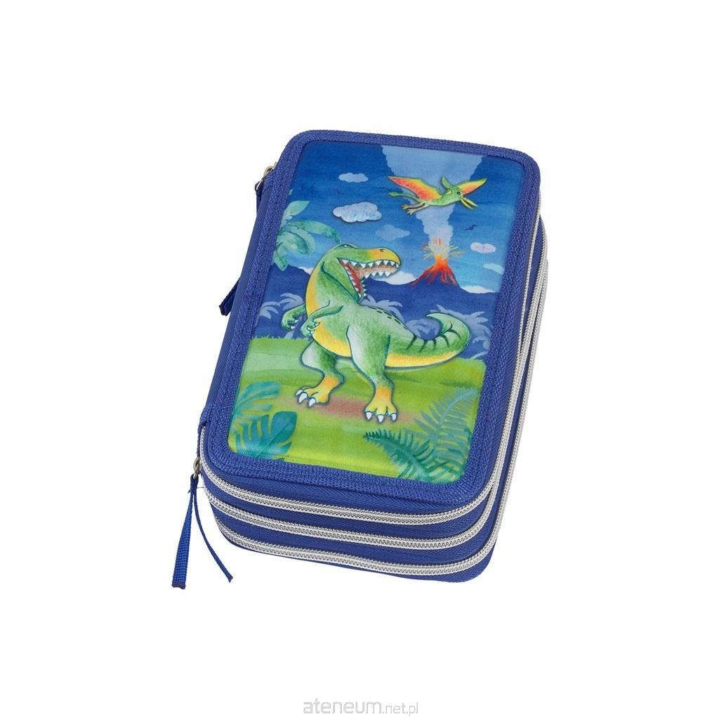3 poziomowy piórnik Dinosaur wraz z akcesoriami od Faber Castell. Ten przestronny piórnik jest podzielony na trzy sekcje, co ułatwia segregację i dostęp do zawartych w nim narzędzi. Co więcej, ten zestaw wypełniony jest 18 ołówkami kolorowymi, 18 pisakami z filcowym końcem, ołówkiem grafitowym Grip HB, dwoma długopisami kulkowymi o grubości 0,7 mm (czerwonym i niebieskim), nożyczkami szkolnymi, klejem w sztyfcie o masie 9g, temperówką z pojemnikiem na odpady, gumką wolną od PVC oraz 15-centymetrową linijką.