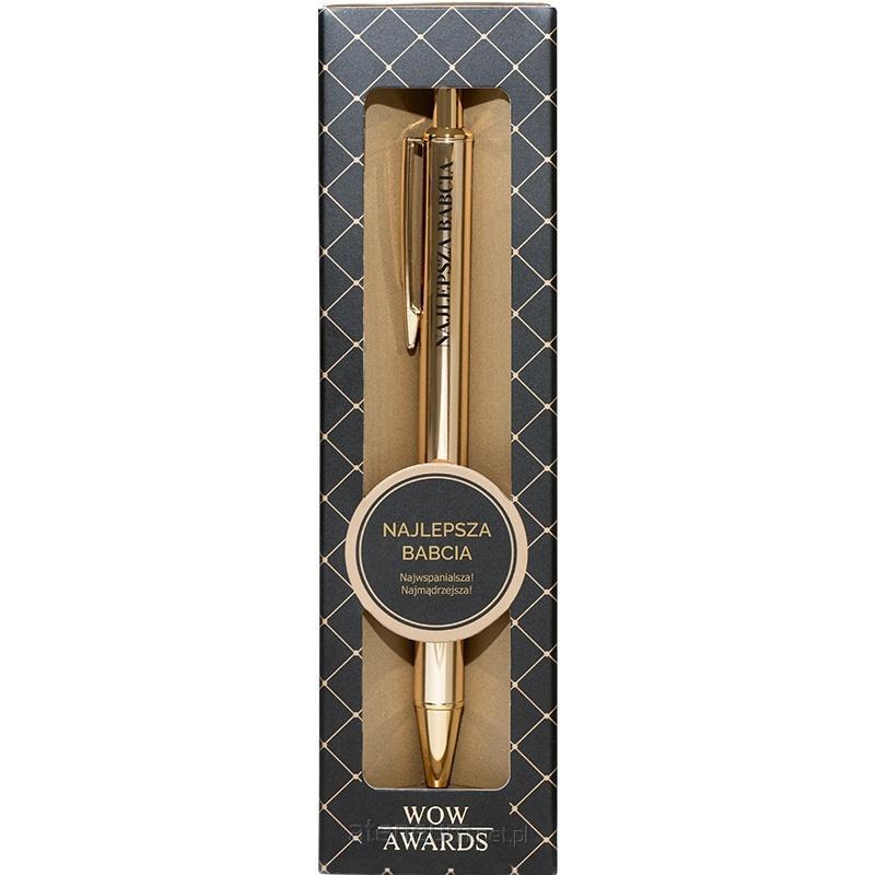 Personalizowany długopis prezentowy z napisem Najlepsza Babcia - idealny upominek dla bliskiej osoby Odkryj wyjątkowy sposób, aby wyrazić swoje uczucia - z naszym personalizowanym długopisem prezentowym "Najlepsza Babcia". Idealny dla każdej ważnej i wyjątkowej osoby Twoim życiu, bez względu na okazję. Świetnie sprawdzi się jako upominek na szereg okazji. Wygląd długopisu Ten elegancki złoty długopis urzeka swoją elegancką, stylową kolorystyką i modnym designem. Złoty odcień, wzbogacony czarnym napisem, nadaje mu wyrafinowany charakter. Unikalny napis wygrawerowany na długopisie, dodaje osobistego akcentu. Specyfikacja: Materiał: Plastik, metal Złoty design Kolor: czarno-złoty Wymienny wkład Kolor wkładu: niebieski Opakowanie: Eleganckie kartonowe pudełko prezentowe