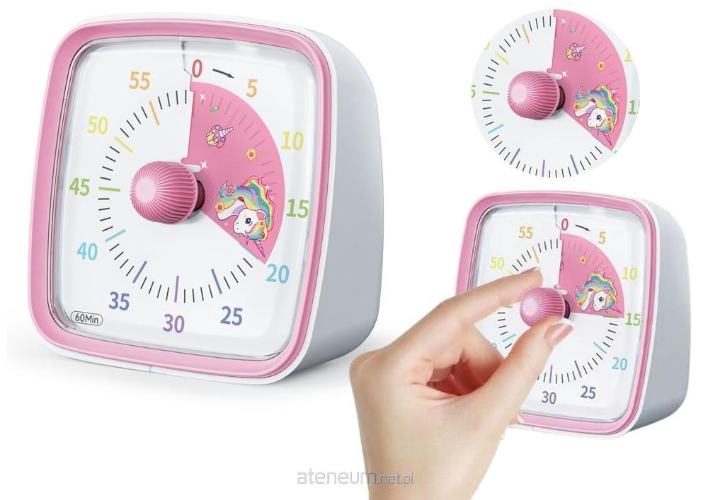 Minutnik Z Alarmem i Światłem Biało-Różowy Pokrętło Z Jednorożcem Ułatw dzieciom naukę czasu dzięki uroczemu, minutnikowi z funkcą alarmu, który łączy funkcjonalność z atrakcyjnym designem. Biało-Różowa obudowa nadaje minutnikowi nowoczesny i stylowy wygląd, który wpasowuje się w każde wnętrze. Biała tarcza z dużymi cyframi w systemie 1-godzinnym podzielonym na minuty, umożliwia dzieciom łatwe śledzenie upływającego czasu w oczekiwaniu na dźwięk alarmu. Minutnik posiada pokrętło, które po użyciu zapełnia tarczę wyjątkowym motywem jednorożca co jeszcze bardziej przyciąga uwagę dziecka. Minutnik jest zaprojektowany z myślą o edukacji i zabawie, co sprawia, że jest idealny dla dzieci, które uczą się czytać czas. Jego przyjazny design i kolorowe wskazówki czynią naukę czasu łatwą i przyjemną. Wymiary minutnika: 10 cm x 10 cm x 4 cm Zasilany dwoma bateriami 1,5V AAA, które nie są elementem zestawu. Posiada certyfikat CE, ponadto jest zgodny z norma EN71.Przeznaczony dla dzieci powyżej 3 roku życia.