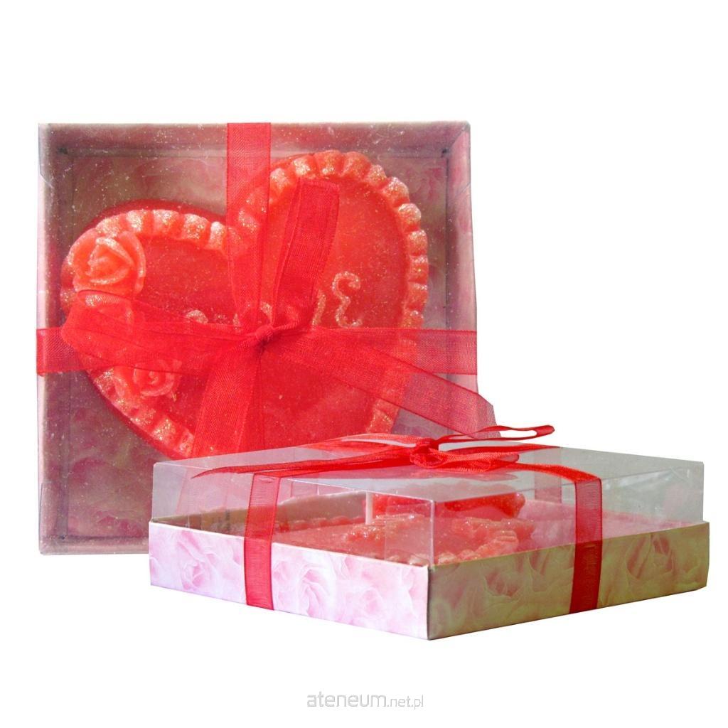 Świeczka w kształcie serca z napisem "Love", zapakowana jako upominek w pudełeczko przewiązane wstążeczką. Wymiar świeczki 9x9cm.