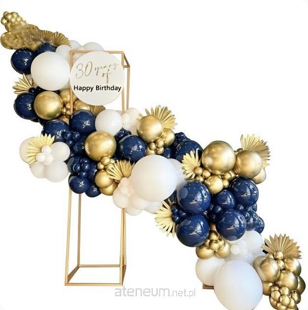 12cm: 15x balony chromowane w kolorze złotym; 5x balony białe; 5x balony ciemnoniebieskie;