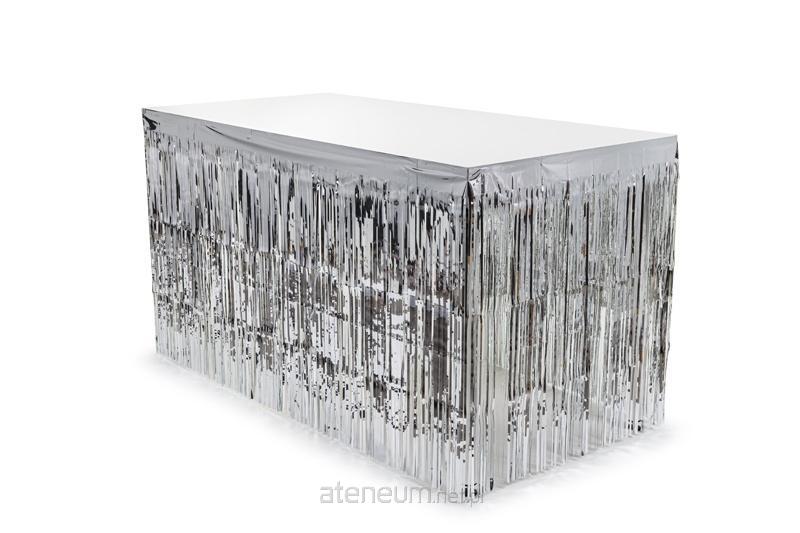 Skirting foliowy metalizowany z frędzlami w kolorze srebrnym, szerokość ok. 300 cm, wysokość ok. 80 cm.
