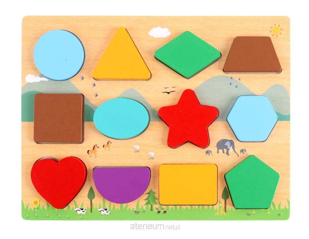 Zestaw zawiera: drewnianą planszę z otworami, 10 kolorowych klocków w kształcie cyfr, 12 figur geometrycznych (koła, gwiazdki, serca itp.).