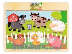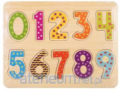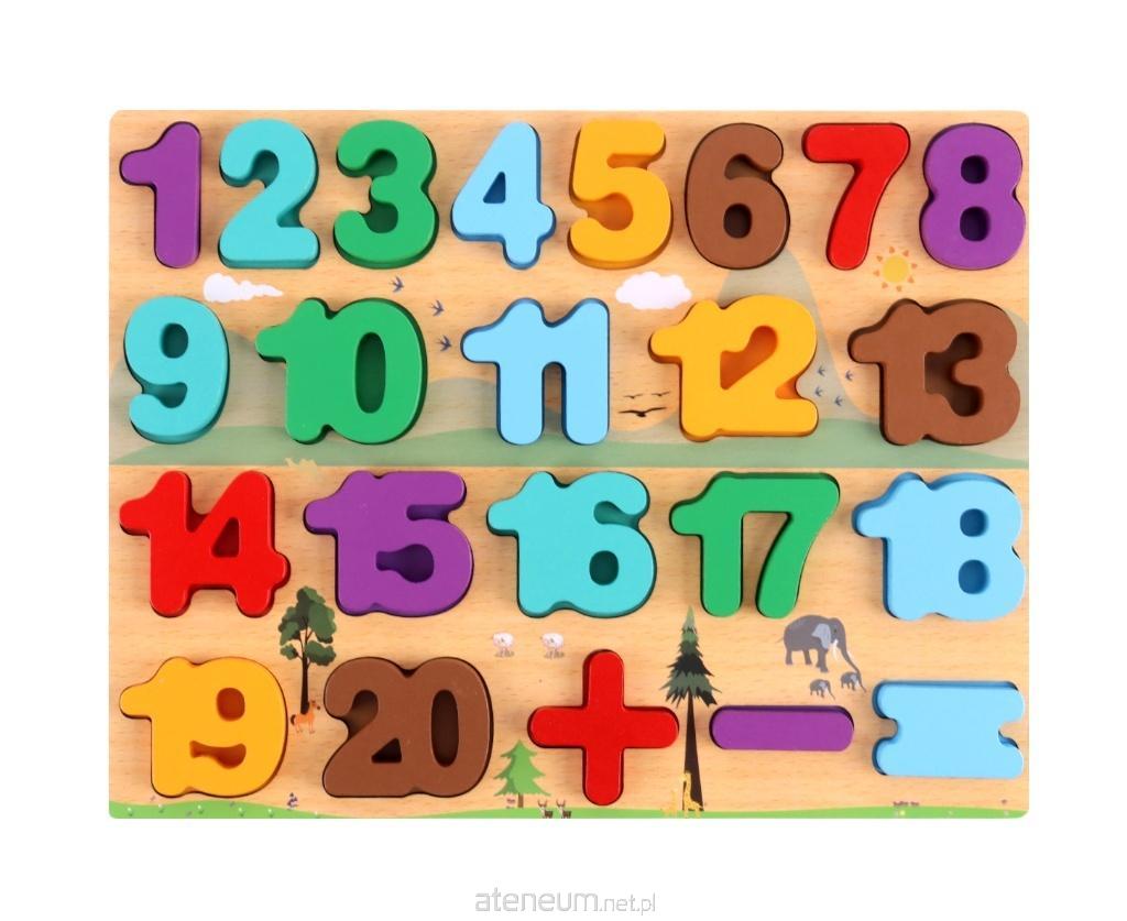 Zawartość zestawu: 20 kolorowych cyfr, 2 znaki matematyczne (+, -), drewniana plansza z otworami dopasowanymi do elementów.