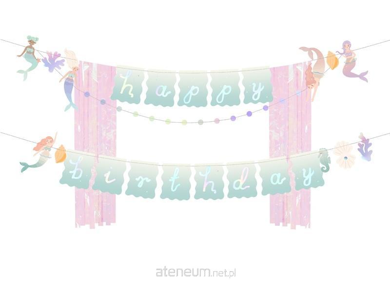 Baner Happy Birthday Syrenka wykonany z papieru, mix kolorów, wymiary ok. 130 x 100 cm, długość sznurka ok. 4.3 m. Produkt do samodzielnego złożenia.