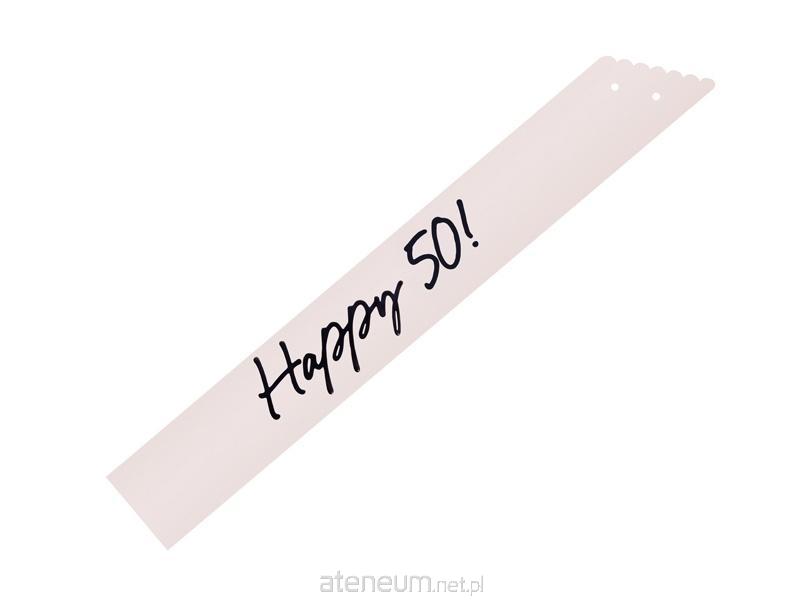 Szarfa papierowa Happy 50 w kolorze kremowym z czarnym nadrukiem, szerokość ok. 9,5 cm, długość ok. 76 cm. W zestawie czarna aksamitna wstążka do związania szarfy.
