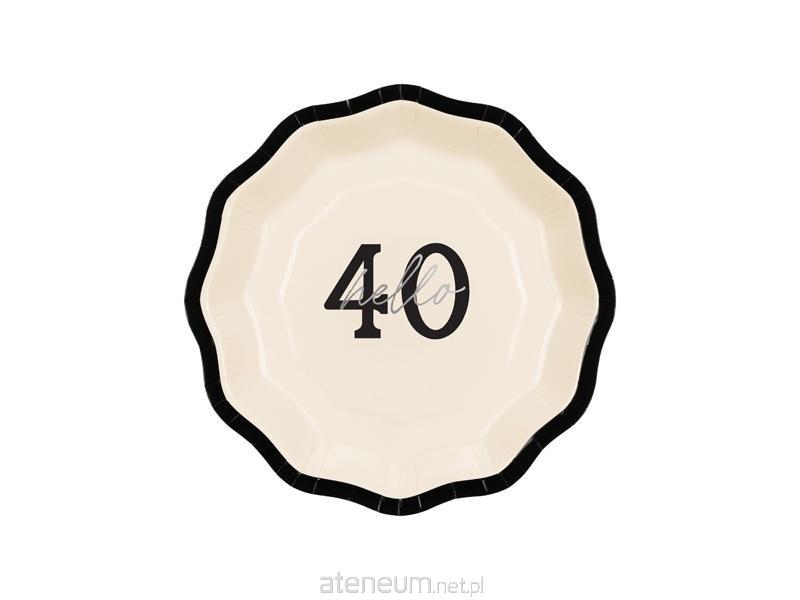 Talerzyki papierowe ''Hello 40''. Kremowe talerzyki na 40 urodziny z czarnymi elementami i srebrnym, błyszczącym napisem Hello. Mix kolorów, średnica około 18 cm.(1 op. / 6 szt.)