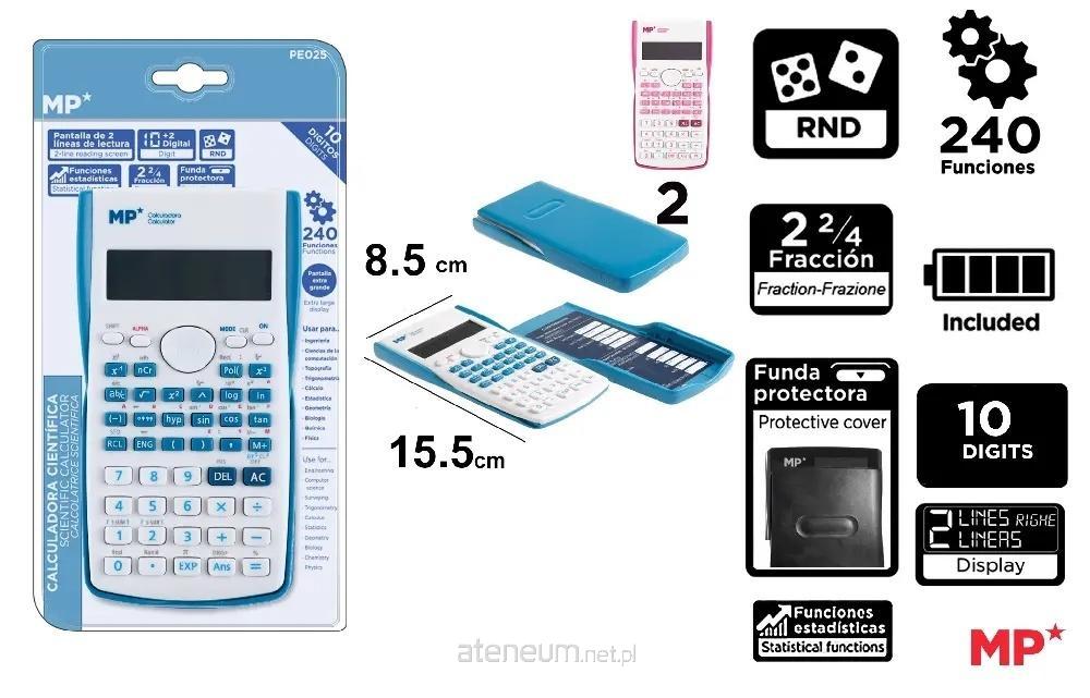 Kalkulator naukowy. 10 + 2 cyfry. 2-wierszowy wyświetlaczodczytu. 240 funkcji. Funkcje statystyczne.Frakcje. RND. Wskazany dla: Inżynierii,Informatyki, Topografii, Trygonometrii,Rachunku, Statystyki, Geometrii, Biologii,Chemii i Fizyki. Zasilanie: w zestawie 1bateria guzikowa. Wymiary: 155 x 85 mm. Z nasadkąochronną. Prezentacja blistrowa. Wymiary: 85x 155 mm. Różne kolory różowy i niebieski.