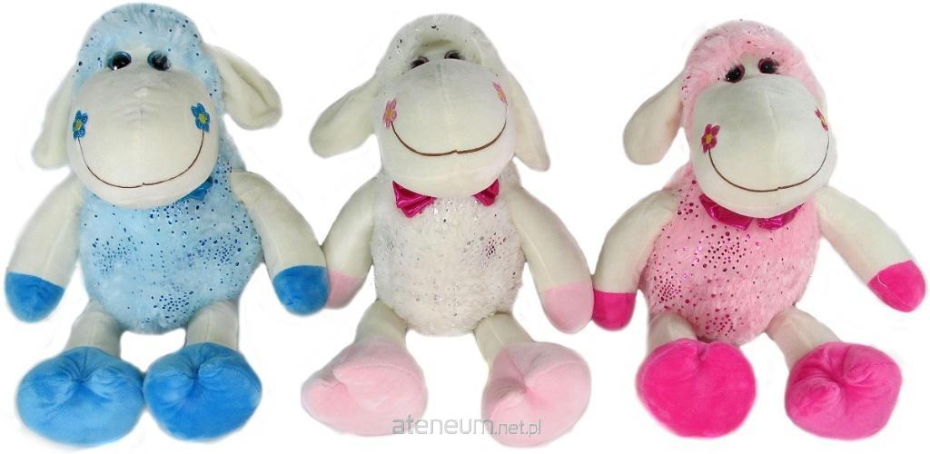 Maskotka o wielkości całkowitej (z nogami) 28cm, siedząc 20cm. Ładne kolory, nietypowy wzór. Do wyboru kolor kremowy, różowy lub niebieski. Cena za sztukę.