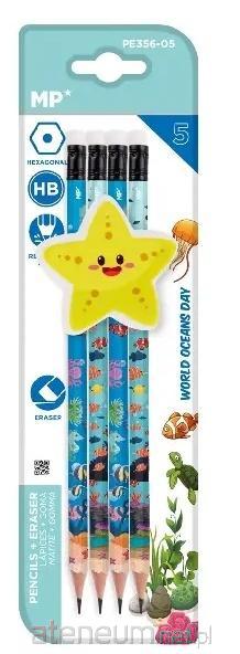 Ołówek sześciokątny HB z dodatkową gumką - Morskie zwierzęta 4szt