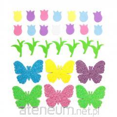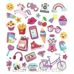 Foliowe naklejki ze słodkimi, różowymi motywami takimi jak np. rolki, lizaki, okulary, kasety magnetofonowe czy rolki.