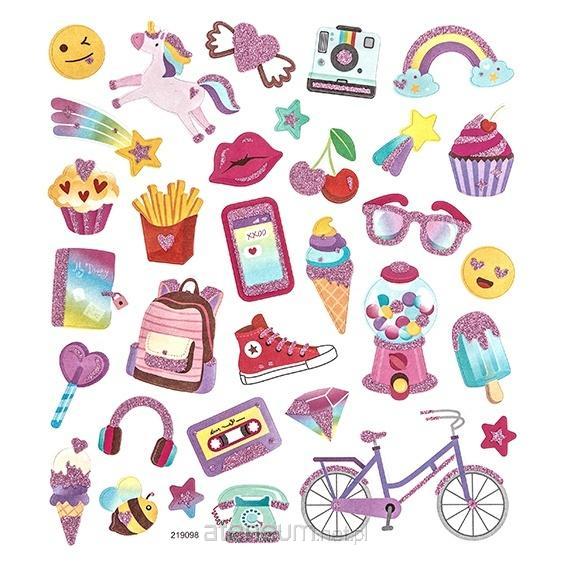 Papierowe naklejki z motywami stylowych przedmiotów, z brokatowym, różowym wykończeniem. W blistrze: jednorożec, tęcza, okulary, mufinki, serca a nawet fiołkowy rower.