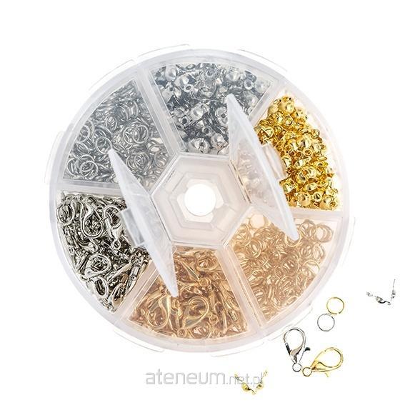 Zestaw półfabrykatów do tworzenia biżuterii w dwóch kolorach: złotym i srebrnym; W zestawie mamy kółka-ogniwa, mini karabińczyki do zapinania oraz końcówki zaciskowe.