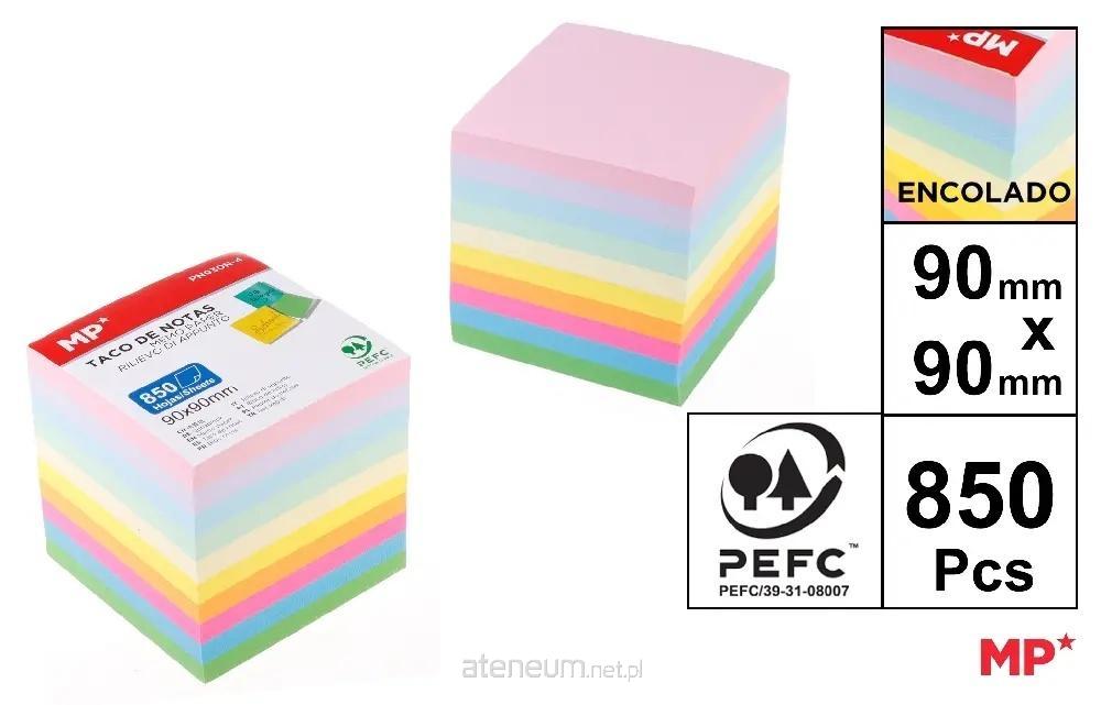 Kostka z kolorowego papieru do szybkich notatek. Gumowane z jednej strony, aby zapobiec ich luzowaniu. Papier 70 g/m2. Wymiary arkusza: 90 x 90mm. Blok 850 arkuszy w kolorach fluorescencyjnych i pastelowych.