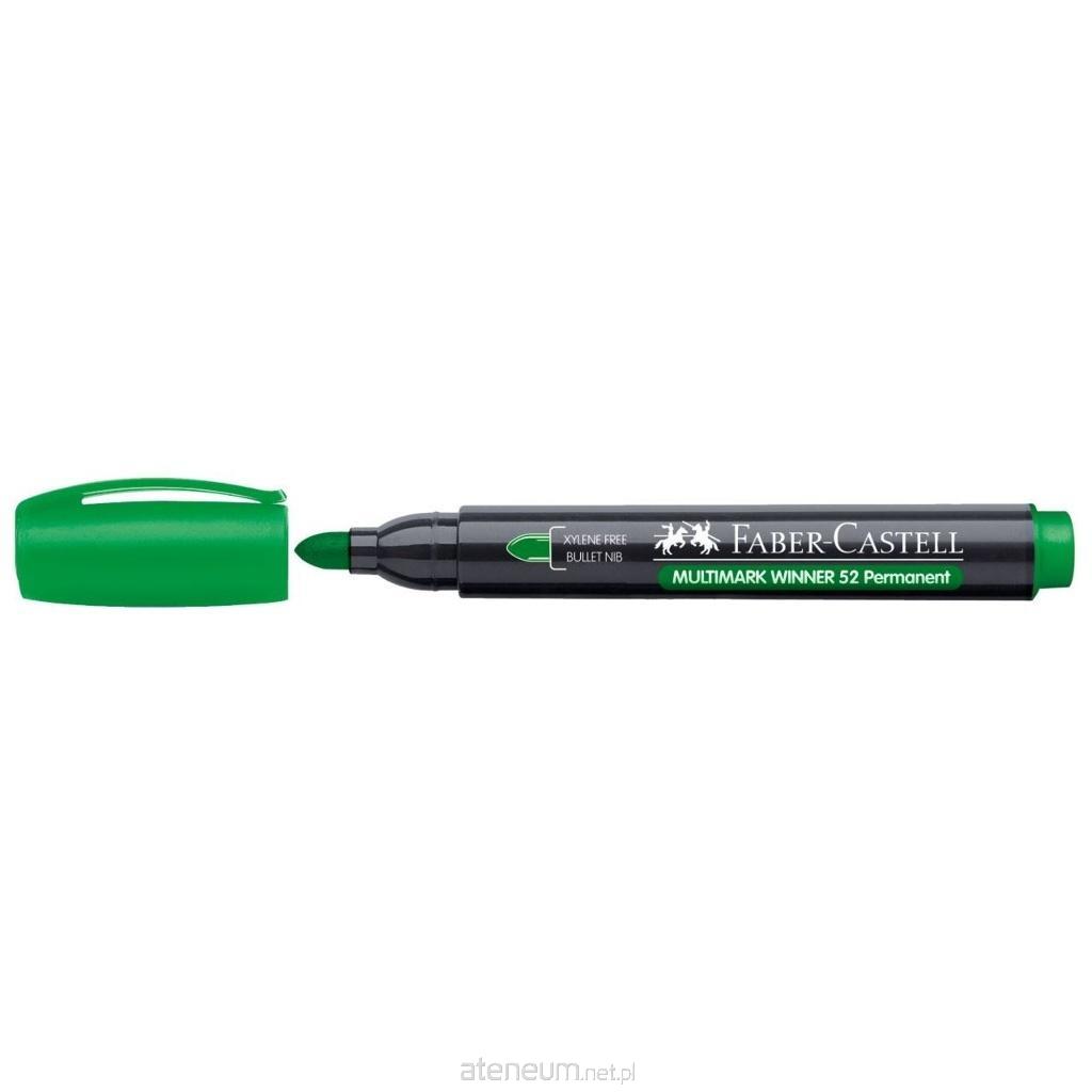 Marker permanentny Multimark Winner 52 Faber-Castell w kolorze zielonym. Wodoodporny, odporny na działanie światła i szybkoschnący. Z tuszem na bazie alkoholu, idealny do niemal wszystkich powierzchni np. drewno, metal, szkło, plastik i karton. Okrągła końcówka pisząca z linią pisania o szerokości 2,8 mm. Ze skuwką i końcówką w kolorze tuszu. Dostępny w 4 kolorach (niebieski, czarny, czerwony, zielony).