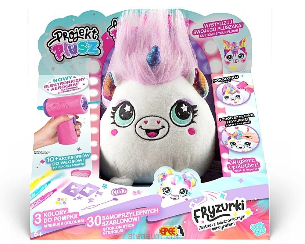 Udekoruj swojego pluszaka za pomocą elektronicznego aerografu w kształcie suszarki do włosów. To takie proste! Przyklej szablon i użyj sprayu, aby stworzyć fantastyczne wzory. Możesz nawet pokolorować mu włosy i stworzyć z nich szałową fryzurkę! A po zabawie, po prostu go wypierz i zacznij od nowa.