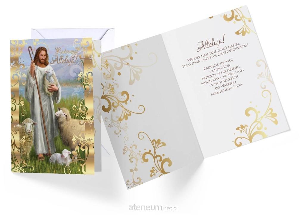 Kartka posiada tekst w środku, dołączona jest do niej koperta.