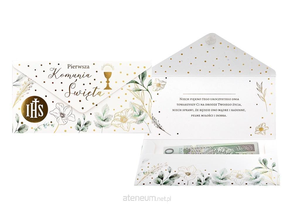 Koperta podarunkowa na I Komunię Świętą KOP-011. Koperta podarunkowa jest eleganckim sposobem na podarowanie bliskiej osobie banknotu lub karty podarunkowej. Koperta jest kolorowa i uszlachetniona metalizowaną folią hot-stamp, jest solidnie wykonana i wyposażona w rzep, co umożliwia jej wielokrotne otwieranie i zamykanie. Koperta zawiera życzenia w środku. Specyfikacja: wymiary: 20 x 10,5 cm (po złożeniu) wnętrze: życzenia w środku okazja: Komunia