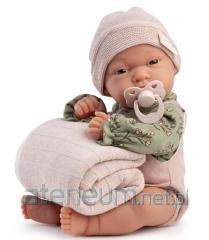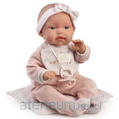 Lalka hiszpańska Petit ze śpiworkiem 27 cm Antonio Juan 12443 Wyjątkową, przeuroczą lalkę hiszpańską Petit cenionej marki Antonio Juan polecamy dzieciom już od drugiego roku życia. Filigranowy, 27-centymetrowy bobas waży ok. 650 g. Dzięki zastosowaniu miękkiego brzuszka świetnie nadaje się do przytulania. Główka z ręcznie wyrzeźbionymi włosami oraz ruchome kończyny wykonano z wysokiej jakości gładkiego, bezpiecznego dla dzieci winylu. Zwraca uwagę realistyczny wygląd twarzy: niebieskie oczy o głębokim spojrzeniu, malowane brwi i rzęsy, lśniące usta oraz delikatnie zaróżowione policzki. Z kolei na dłoniach i stopach są zarysowane autentycznie wyglądające paznokcie oraz linie papilarne. Atrakcyjności zabawce dodaje miękki różowy śpiworek. Bobas z miękkim brzuszkiem to propozycja pierwszej lali dla najmłodszych Lalka hiszpańska Petit 12443 jest ubrana w ciepłą bawełnianą, zapinaną na rzep różową piżamkę, zdobioną wzorzystą falbanką. Całość dopełnia miękka czapeczka dekorowana kokardką oraz smoczek zawieszony na satynowej tasiemce. Wszystkie części garderoby można z łatwością zdjąć, a bobasa przebrać. Luksusu dodaje firmowe kartonowe, solidne, pięknie zaprojektowane pudełko z wieczkiem. Może ono posłużyć jako opakowanie prezentowe a następnie łóżeczko dla lali.