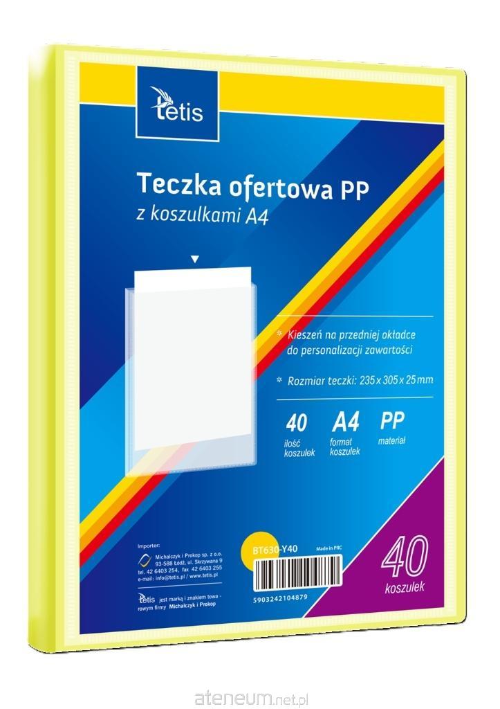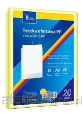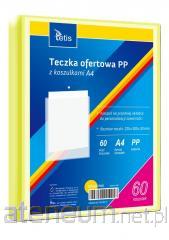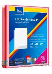 Teczka ofertowa PP z koszulkami. Posiada grzbiet i kieszeń opisową na przedniej okładce, format A4 Teczka posiada 13 przegród. Wymiary teczki: 330x245x35 mm, grubość tworzywa PP: 0,50 mm. Dostępna w pięciu kolorach (niebieski, czerwony, pomarańczowy, żółty, czarny). Opakowanie: folia 1 szt.