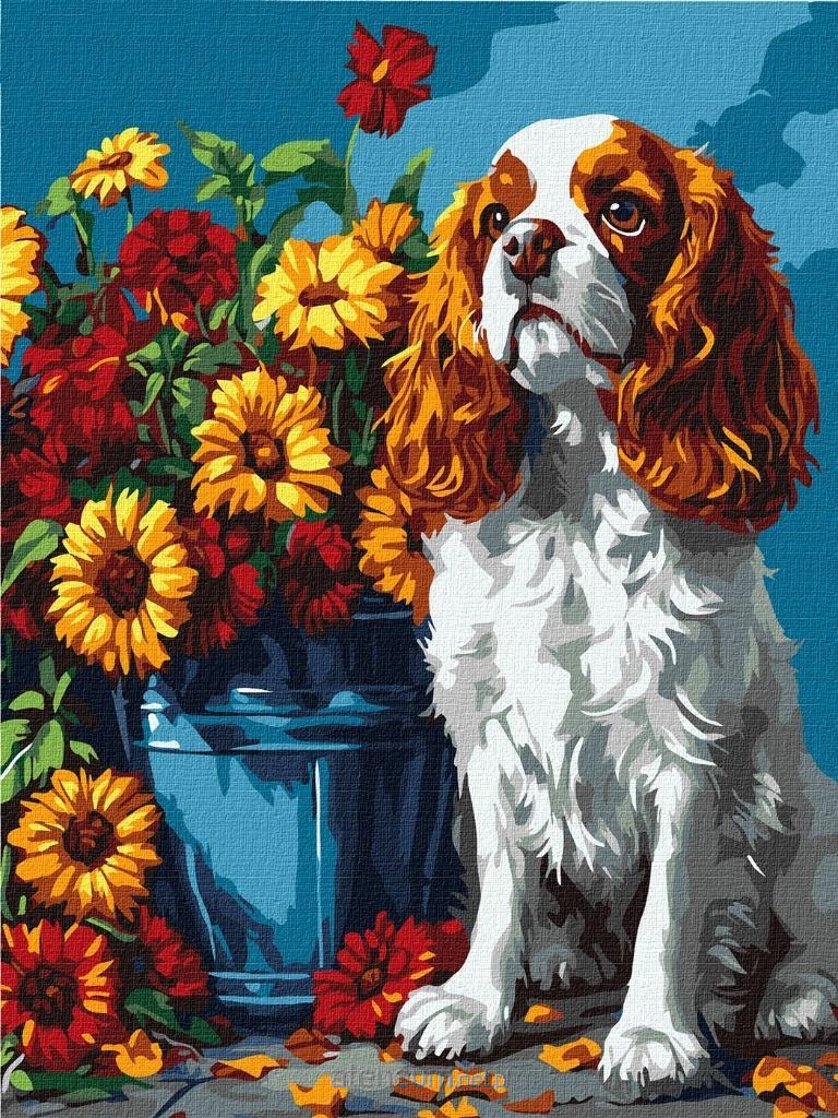 Malowanie po numerach - Spaniel i kwiaty 30x40cm