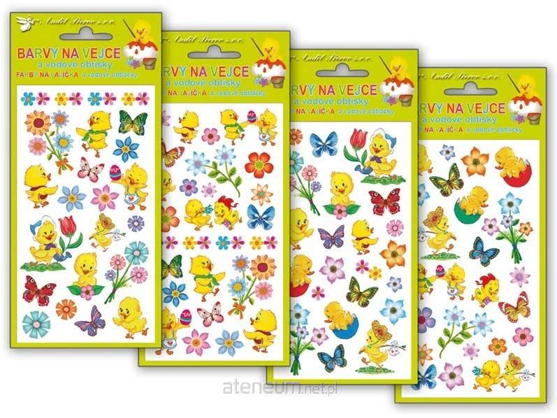 Opakowanie zawiera 4 szt. po 5 g farby proszkowej (żółta, pomarańczowa, czerwona, zielona) i wielkanocne naklejki wodne. Sposób użycia Zawartość woreczka rozpuścić w 0,5 l wrzątku i dodać 4 łyżki octu. Do zabarwionego roztworu włożyć czyste, odtłuszczone i ugotowane na twardo jajka. Po kilku minutach wyjąć zabarwione jajka i pozostawić do wyschnięcia. Następnie wyciąć wybrany motyw i usunąć folię ochronną. Cały obrazek zanurzyć w misce z wodą, przyłożyć do ugotowanego jajka wzorem do skorupki i delikatnie przycisnąć. Odczekać 20-30 sekund i delikatnie zdjąć papier bazowy. Pozostawić do wyschnięcia.