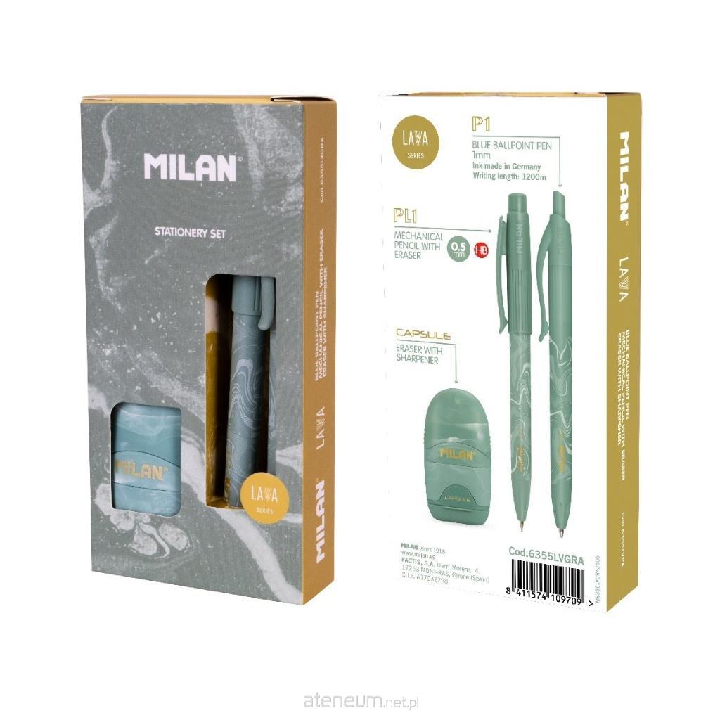 Zestaw do pisania z serii Lava, która jest inspirowana erupcjami wulkanów i ruchem stopionej skały, idealny na prezent. Zestaw zawiera: długopis P1 z niebieskim tuszem, ołówek automatyczny z grafitem HB 0,5 mm, który tworzy cienką linię i jest średnio twardy i posiada na końcu wykręcaną długą gumkę do wymazywania oraz temperówko-gumkę CAPSULE na cienkie kredki i ołówki z pojemnikiem na ścinki i bezpiecznym ostrzem. Wszystko to oryginalne produkty stworzone przez własny dział badawczo - rozwojowy MILAN. Rozmiar opakowania: 14,5 x 7,3 x 2,5 cm. Rozmiar długopisu: 14,1 x 1,7 cm. O 1 cm. Rozmiar ołówka: 14,4 x 1,5 x 1,1 cm. Rozmiar temperówko-gumki: 6.5 x 3.5 x 2.4 cm. Dostępne zapasowe gumki do temperówki i ołówka. Kolor zielony.