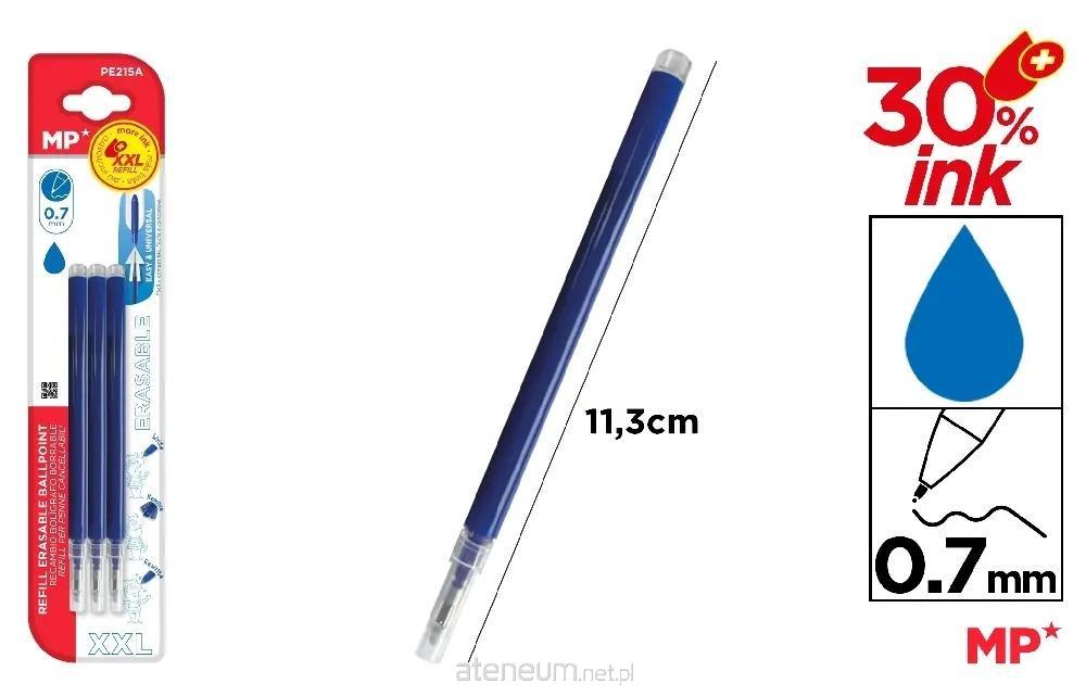 Wkład do wymazywalnego długopisu. Tusz niebieski, łatwy do korekty. 30% więcej tuszu. Końcówka 0,7 mm. Blister 3 szt