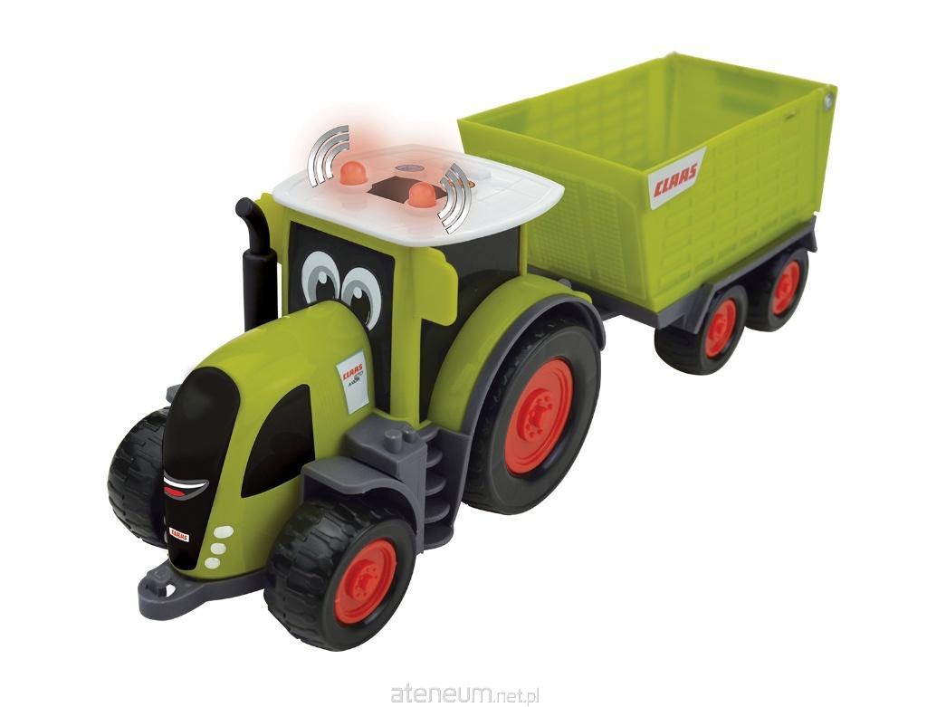 W zestawie Traktor Class Kids znajduje się pojazd traktora i przyczepa. Traktor i przyczepa są w kolorze zielonym z kołami w kolorze czarnym z czerwonymi dodatkami. Po naciśnięciu odpowiedniego przycisku na kabinie, traktor wydaje dźwięk silnika, a także zapalają się światła ostrzegawcze. Przyczepa typu Cargos ma otwieraną tylną klapę, a cały zestaw ma ok. 28 cm długości. Swoimi słodkimi oczkami pojazdy CLAAS Mini oczarowują najmłodszych i wywołują uśmiech na ich twarzach. Zabawka jest przyjazna dla dzieci dzięki zaokrąglonym rogom i krawędziom i idealnie pasuje do rączek małych dzieci.