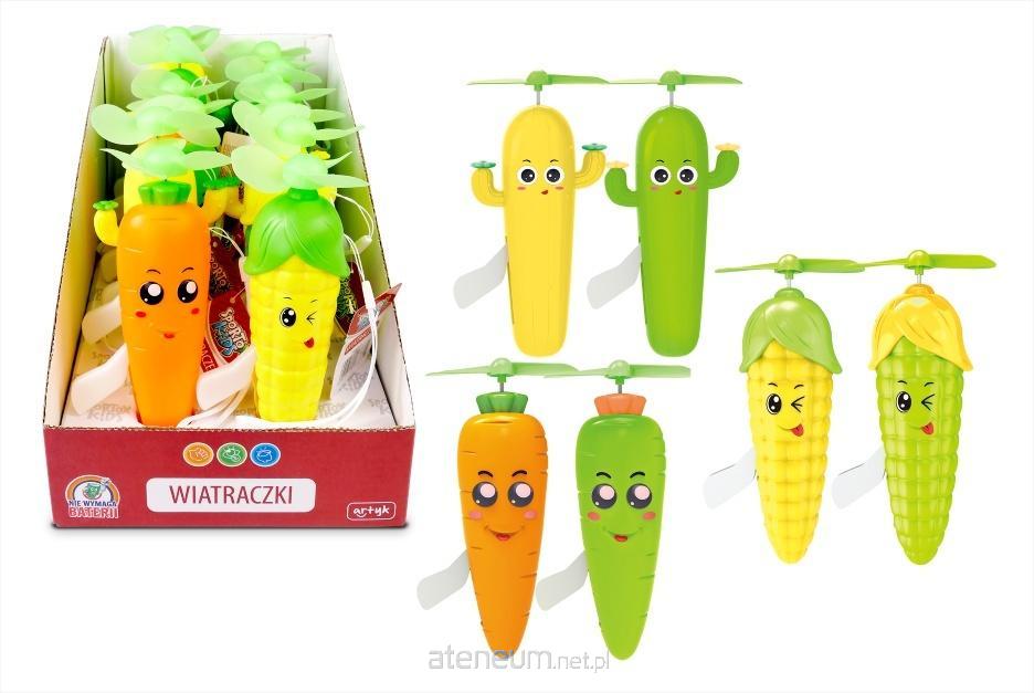 Opis: 12 szt/disp, wys. wiatraczka: 17 cm., 3 wzory: marchewka, kukurydza, kaktus, nie wymaga baterii, wym. opakowania: 17,5 x 31 x 17 cm, 3+