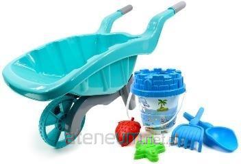 W zestawie: taczka wym. 28,5 x 25 x 59 cm, wiaderko z rączką i pokrywką wym. 18 x 16 cm, 2 foremki do piasku, grabki dł. 22 cm, łopatka dł. 22 cm, pakowane w siatkę, 3+